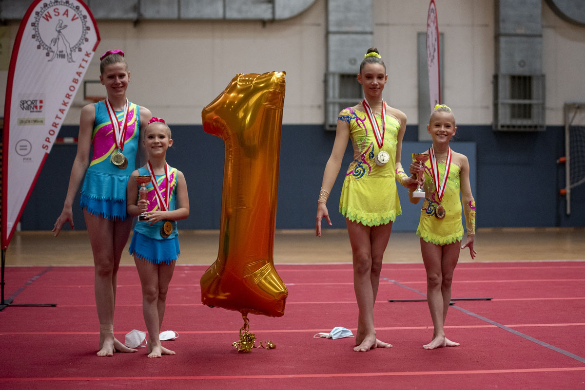 Celina Miller-Aichholz – Pauline Haiden – Lea Krisper waren zuerst dran. Sie zeigten eine sehr tolle Kür, hatten allerdings bei der Sprungserie einen kleinen Schnitzer und mussten dafür Abzüge hinnehmen. Dann waren Samara Kurth – Klara Tomas – Antonia Dusek an der Reihe. Auch sie zeigten eine tolle Kür und haben sich im Vergleich zum vorigen Wettkampf in Graz (01.+02.Mai 2021) stark verbessert. In der Gesamtwertung belegten Samara – Klara – Antonia den hervorragenden 3. Platz und Celina – Pauline – Lea den fünften Platz. (Insgesamt waren 7 Formationen am Start.)